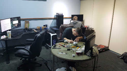 Connecting and packaging all the hardware was a bit out of my comfort zone (which is happily programming in a dark room with headphones and coffee) but the hardware was simple enough that this was a good first time electronics project. To help with the case design and assembly I enlisted my longtime friend Chris Stirpe (Chris tests and assembles jet engines for a living so this was a walk in the park for him). We needed to wire up the servos and two high-power infrared LED’s to an external power supply, attach the servo control lines to the Pi and build a frame to secure everything to. Chris came over for a weekend that started with a long trip to the closest electronics store (Toronto) and then Home Depot. When we got back we grabbed drinks, turned on some music and got to work. My job was to sort out all the electrical stuff. I spent the first couple hours cutting, splicing and soldering wires to make the right connections and sizes we needed. After that I attached resistors to our LED’s (My first time using Ohm’s Law and W=V*A in real life. My first-year physics prof would be proud). Now everything was in one piece and ready to wire up all our components. While I did that, Chris took measurements and designed the frame and case. After a couple hours, he got to work cutting out stainless steel plates for the frame and drilling holes where the posts would go to attach everything. Once we both had our pieces ready we assembled everything and tested it. When we determined that everything was working we bolted and soldered it all down.